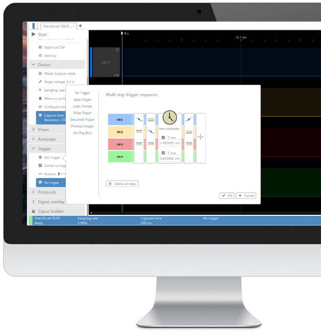 ScanaQuad comes with state of the art hardware-side trigger engine that lets you define virtually any trigger sequence you can imagine. It can be a simple rising edge, or a combination of logic levels, edges, pulse widths, timing constraints that need to be met, and more.